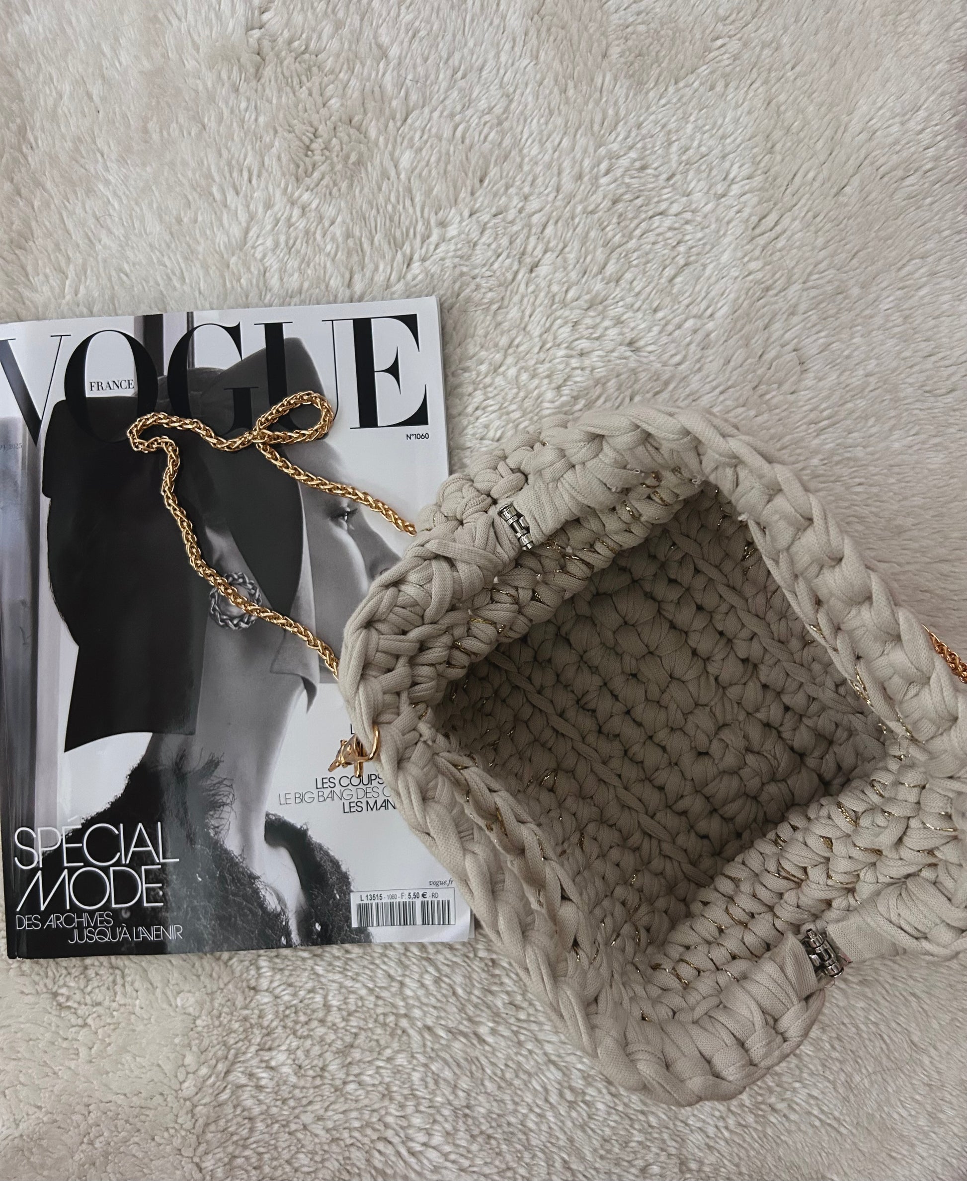 Clutch bag beige with gold lurex and 120 cm golden chain. 80% cotton 20% polyester.