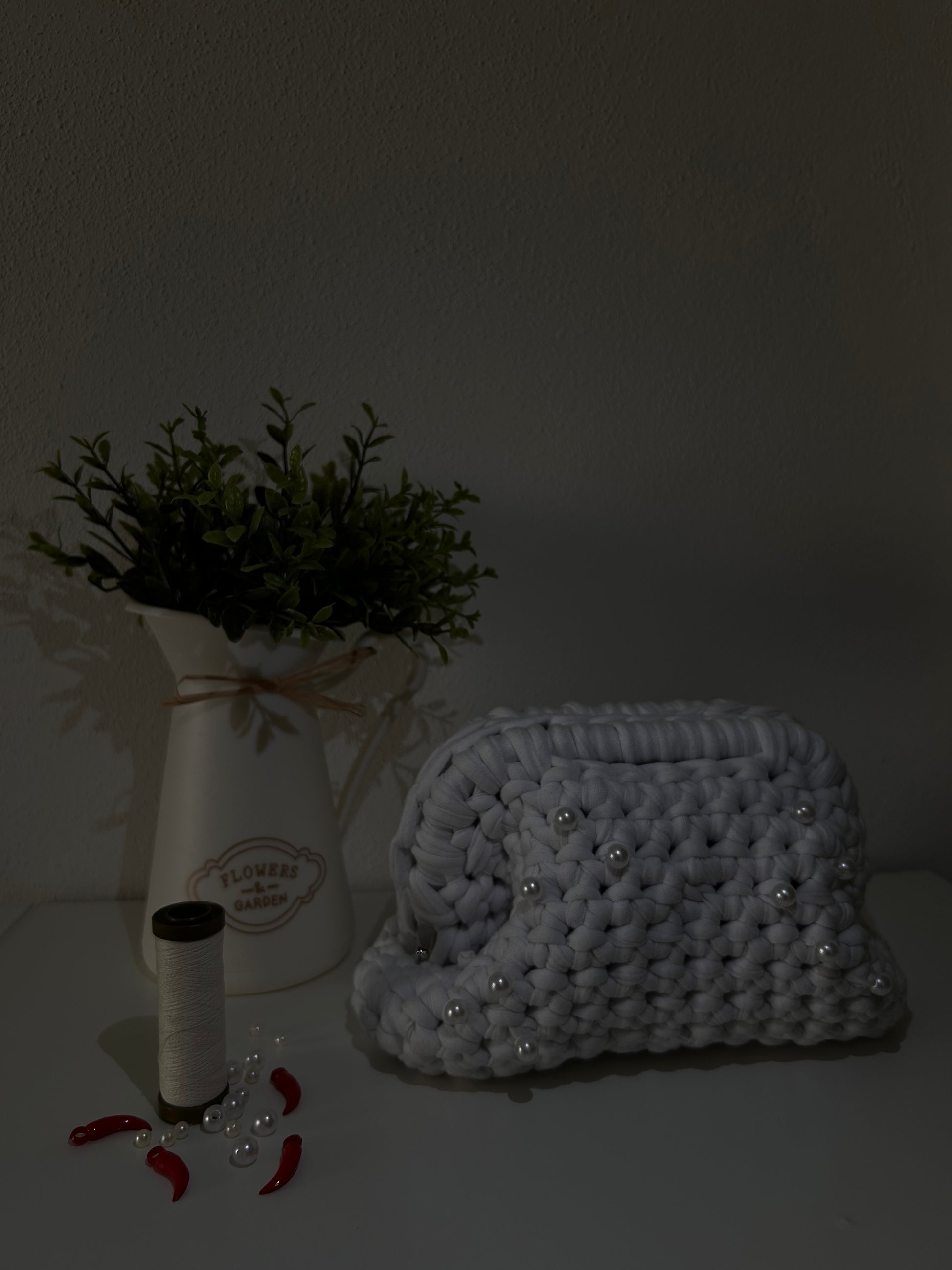Clutch bag mini, 80% cotton 20% polyester, pure white, with hand-stiched pearls.