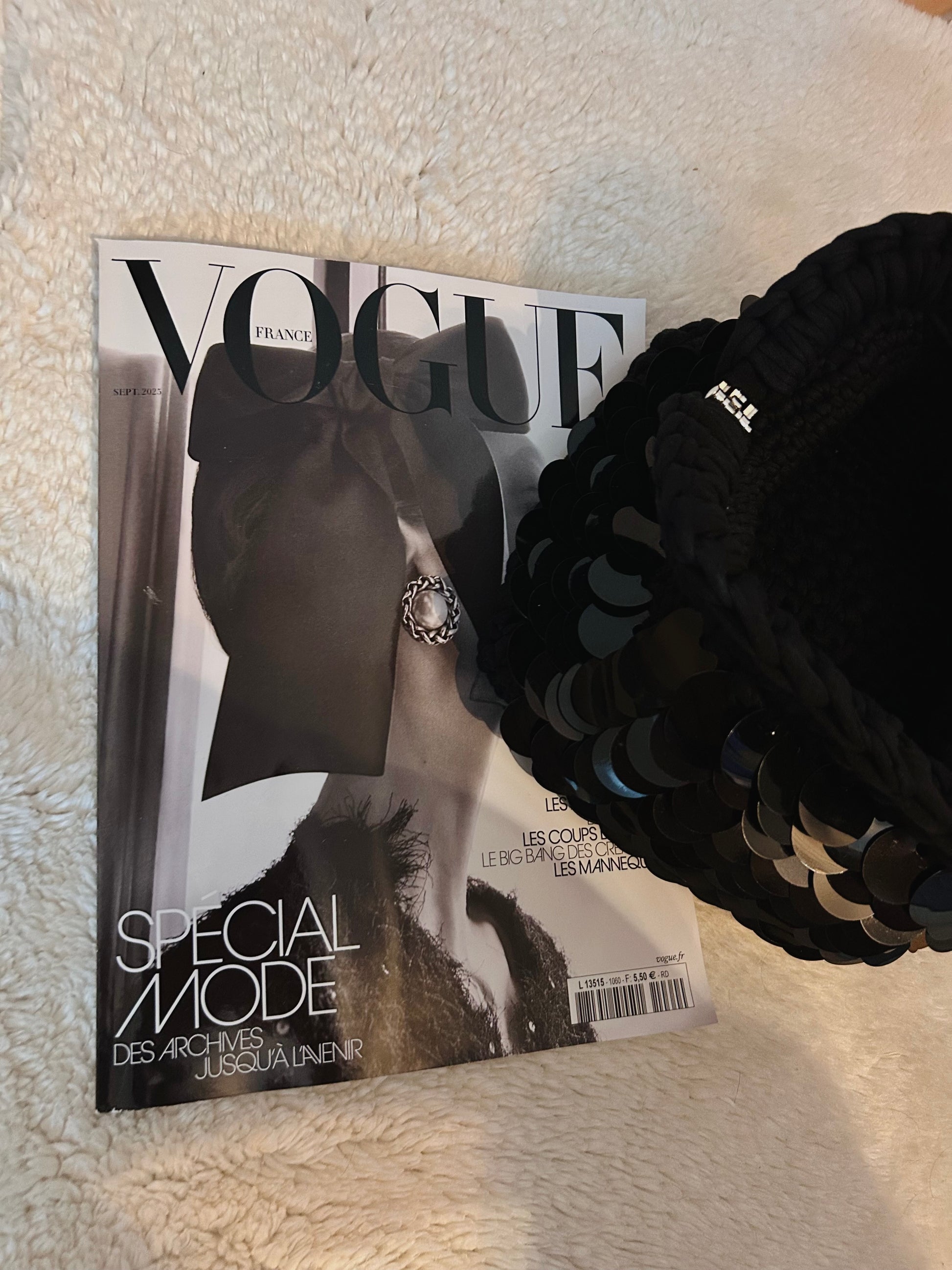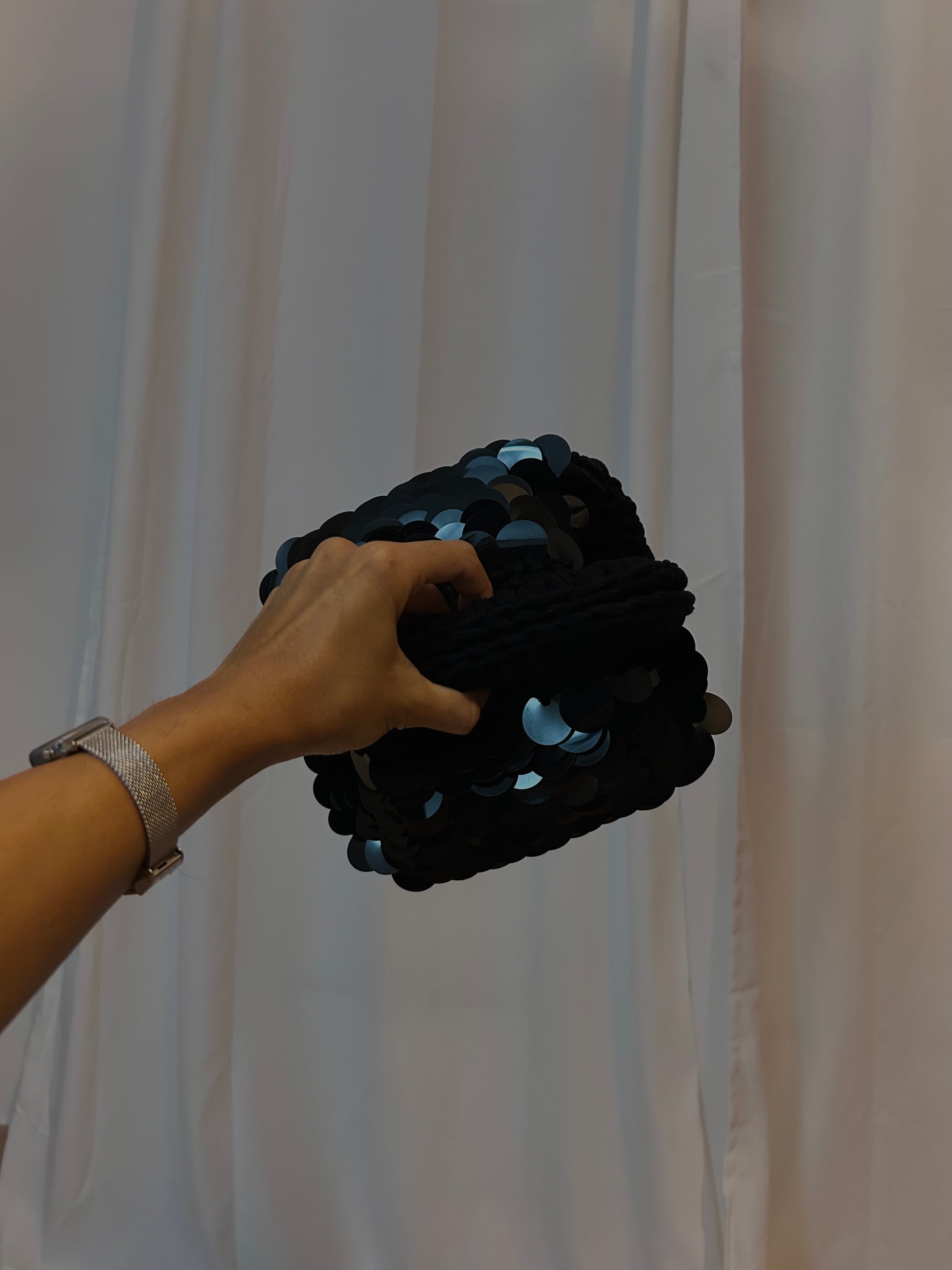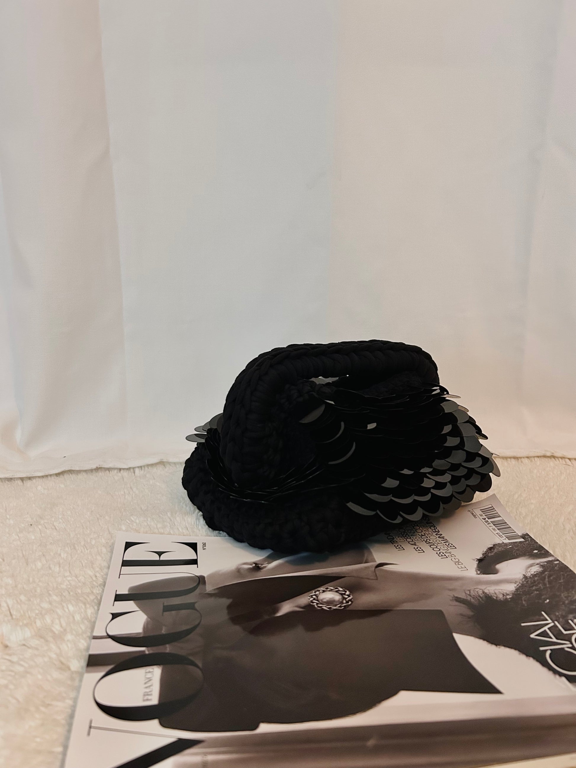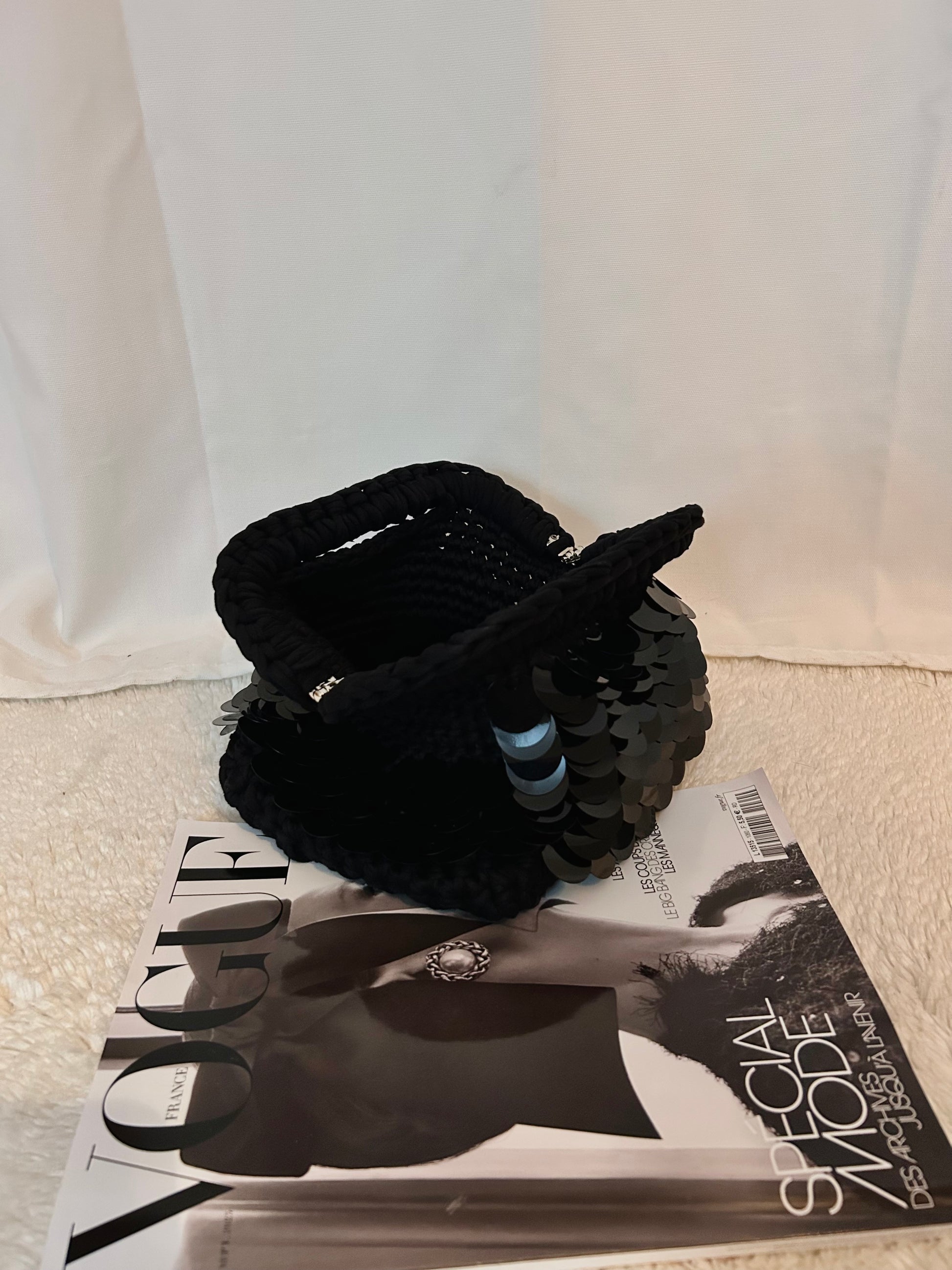 Clutch with black paillettes, medium size. 80% cotton 20% polyester.