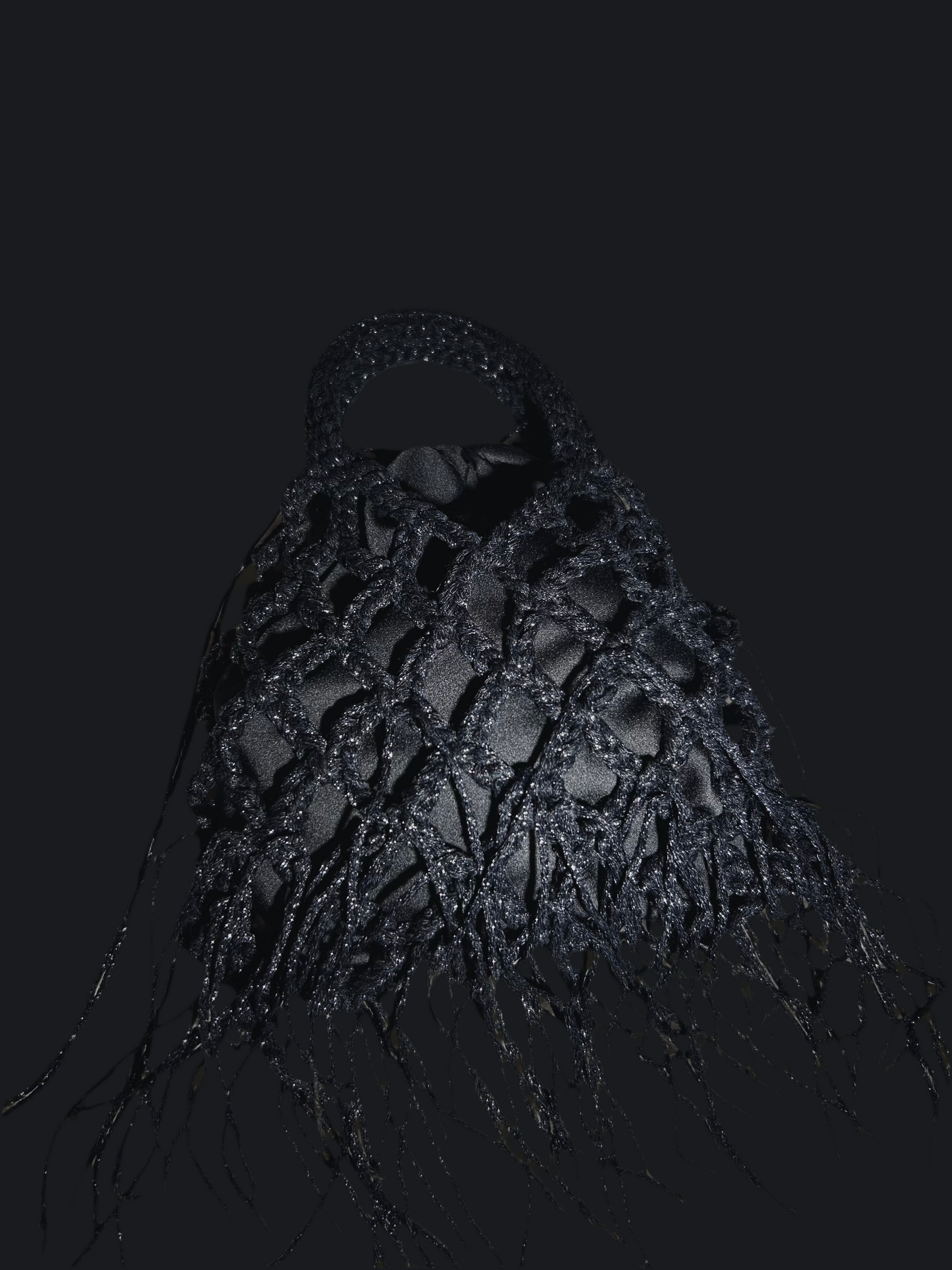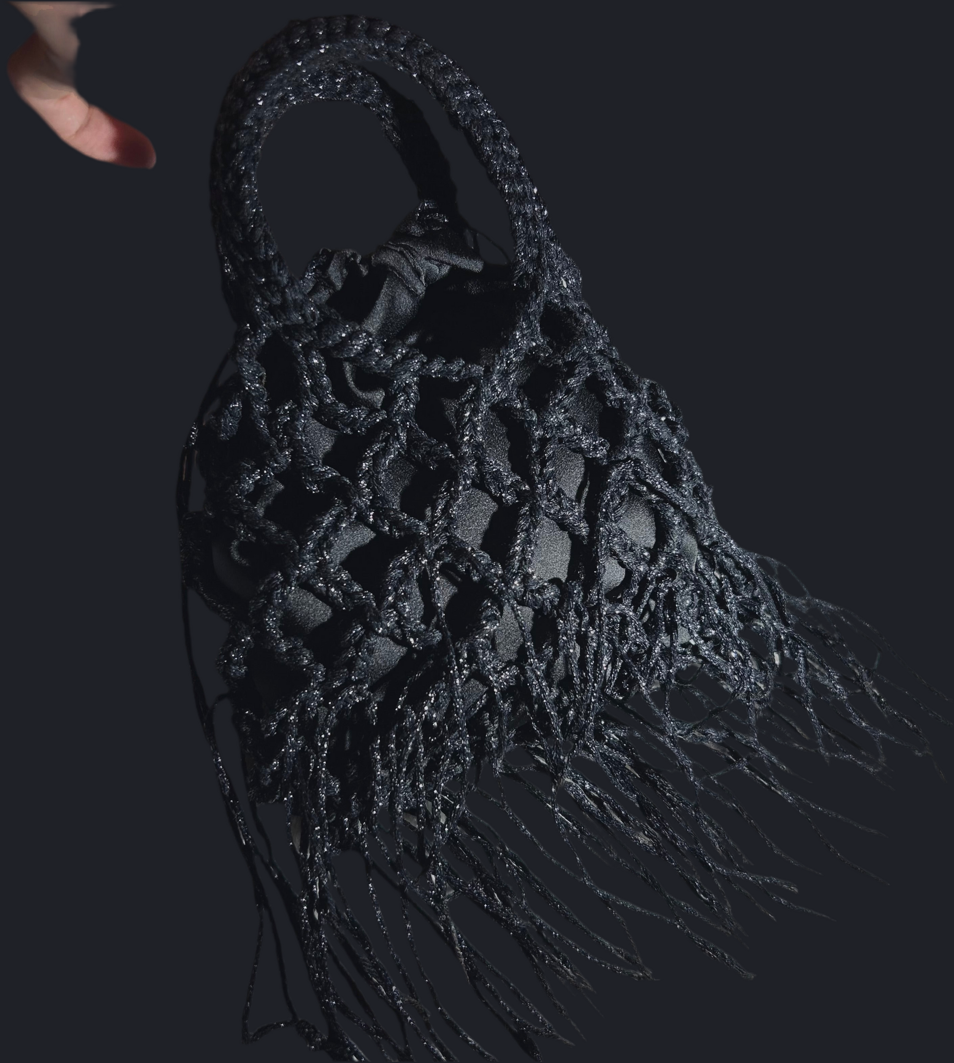 The Sparkling mini bag features intricate black Thai cord with sparkling glitter and stylish fringed accents.