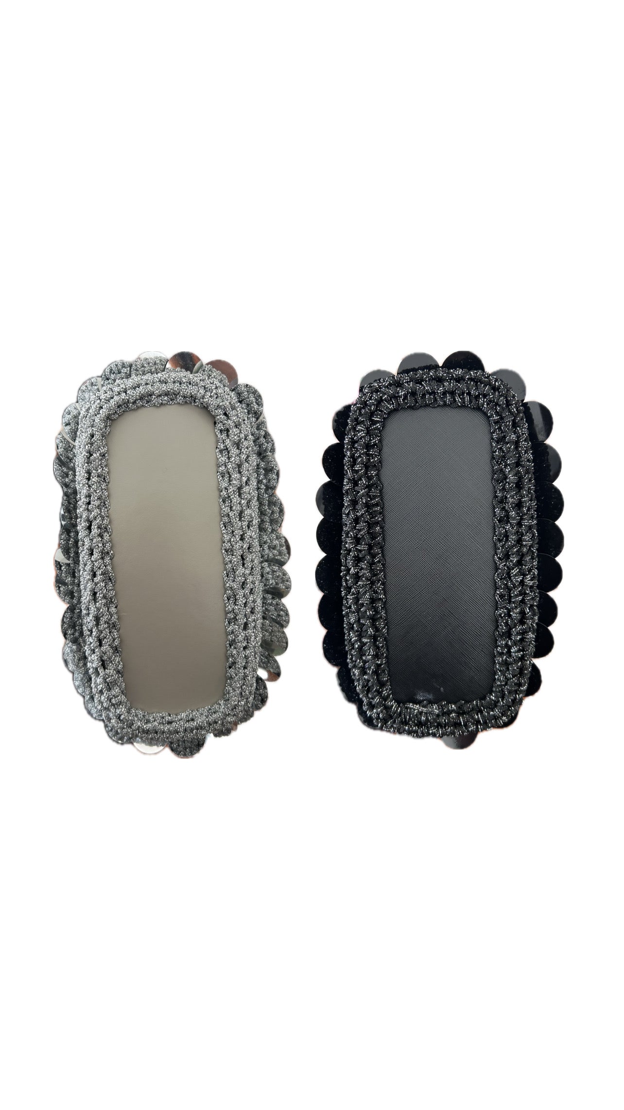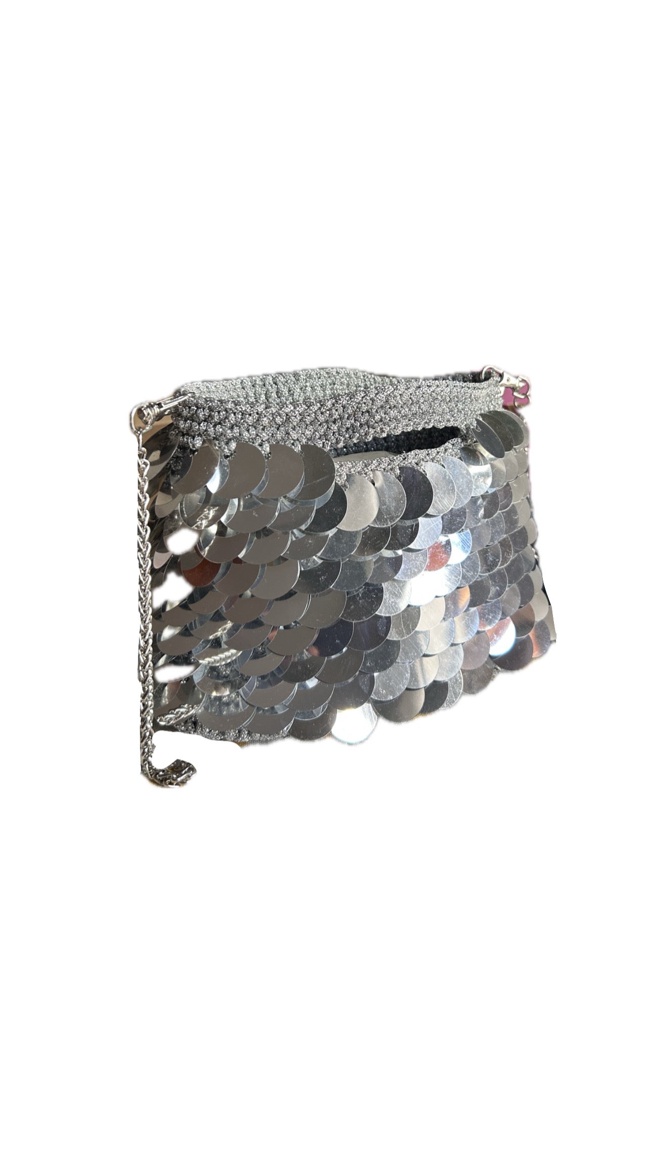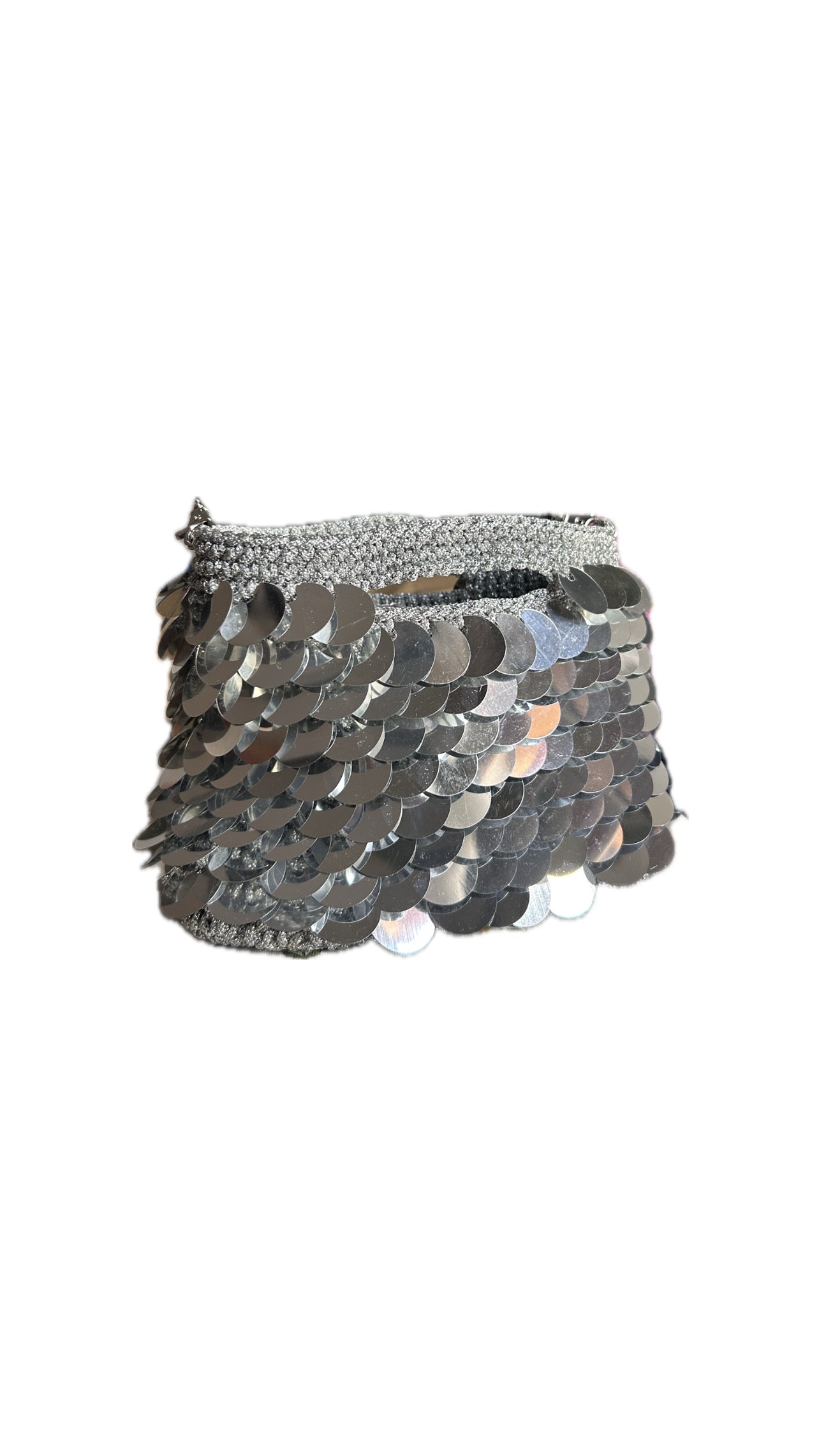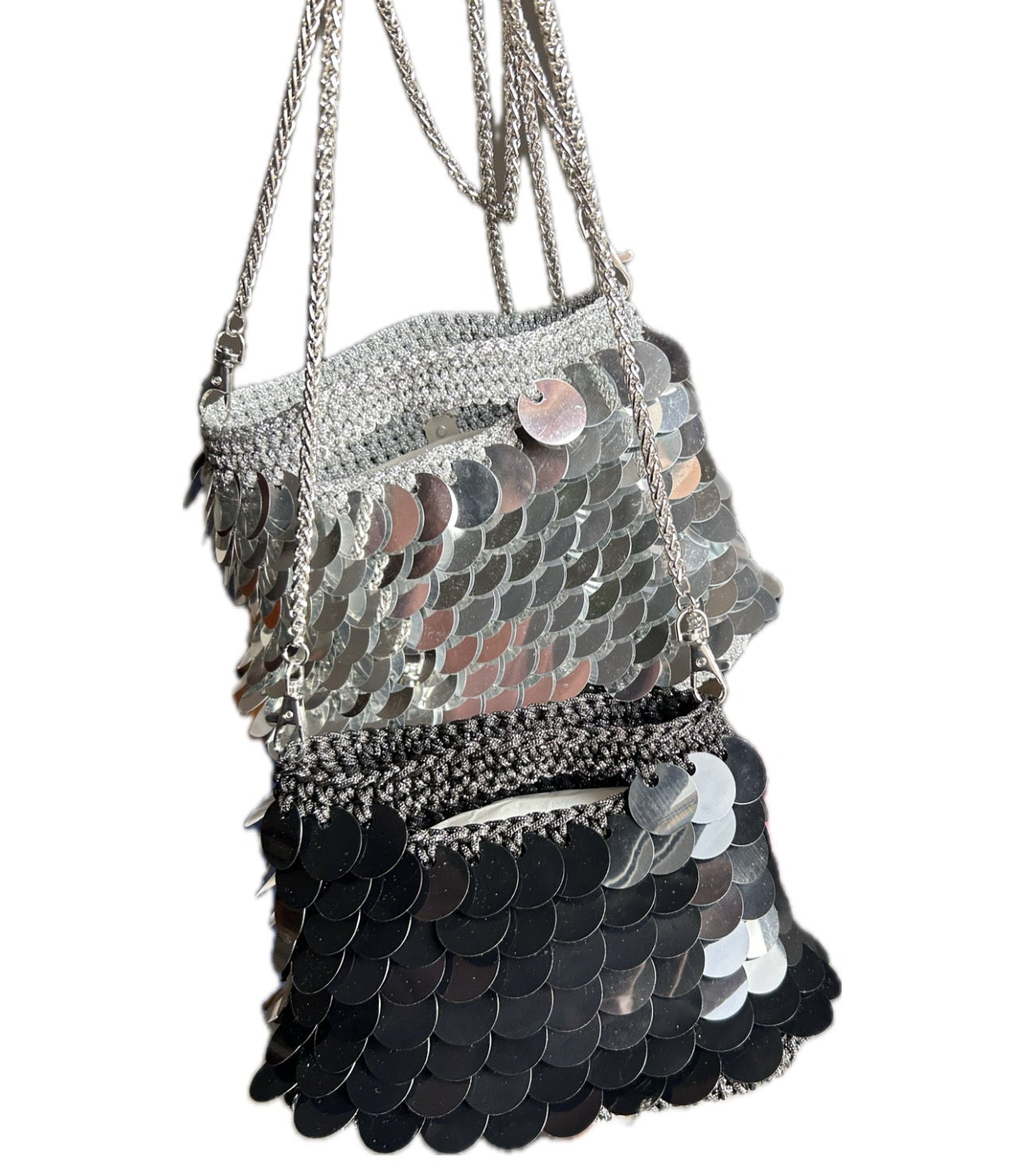 Crafted with a black faux-leather base, glittered black cord, and individually hand-applied black sequins, this piece blends meticulous craftsmanship with refined elegance. The silver-tone chain adds a touch of luminosity and complete a distinctive and sophisticated design.