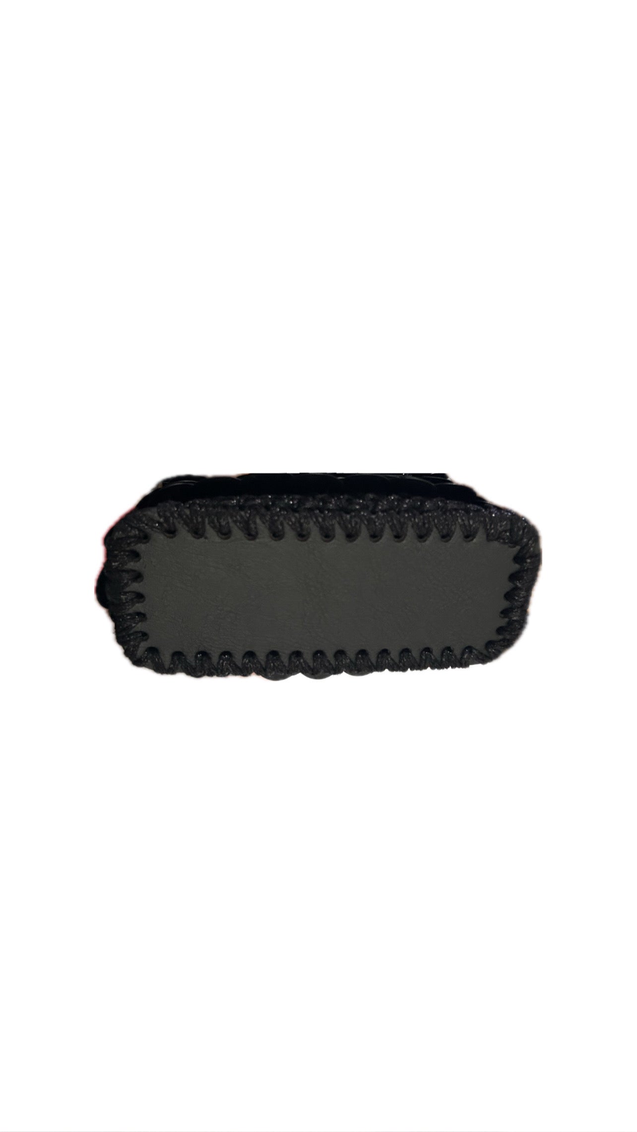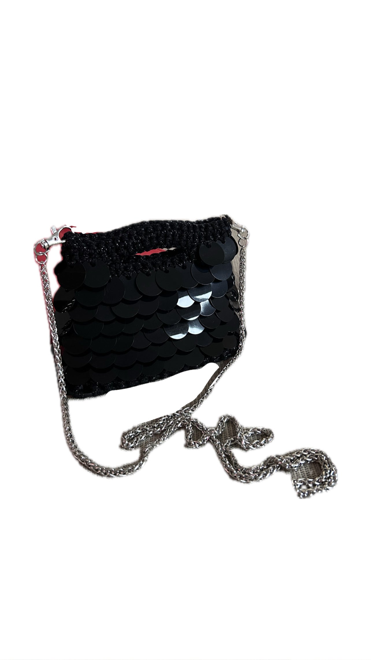 Crafted with a black faux-leather base, glittered black cord, and individually hand-applied black sequins, this piece blends meticulous craftsmanship with refined elegance. The silver-tone chain adds a touch of luminosity that enhances and balances the depth of the black, completing a distinctive and sophisticated design.